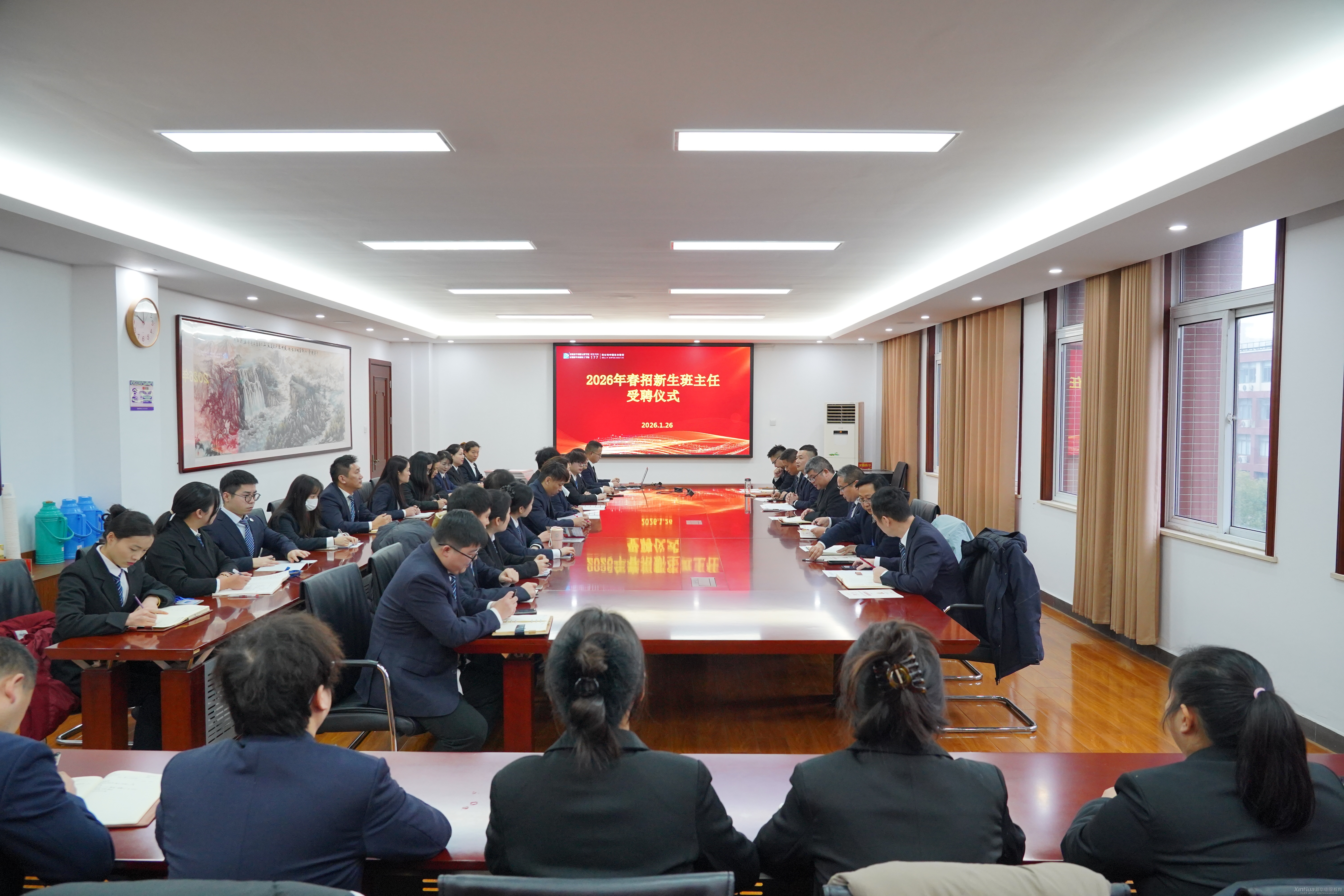 1月26日上午,安徽新华高级技工学校2026年春季新生班主任受聘仪式在学术报告厅举行。各系部新聘班主任从校领导手中接过象征责任与使命的聘书,并签署《班主任育人军令状》,以庄严仪式开启新生护航之旅。